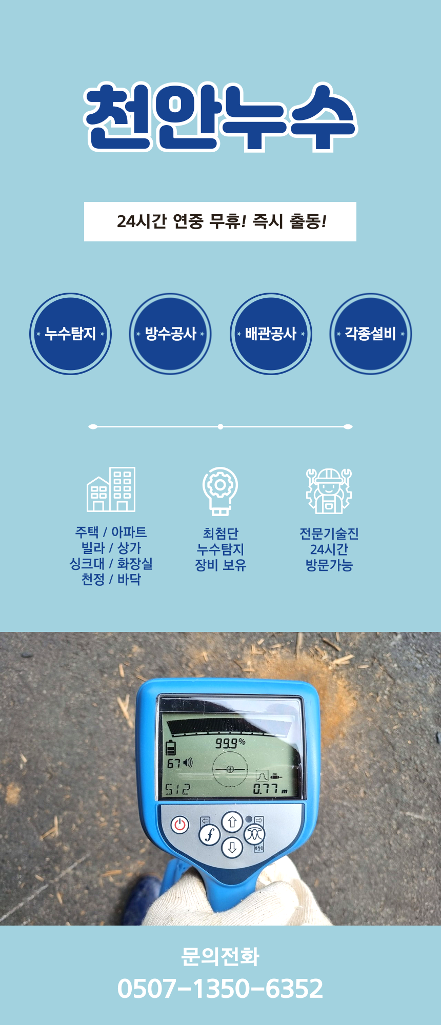 1. 초기 징후 포착 및 육안 검사 천장에 물자국이 보이기 시작하면, 가장 먼저 해야 할 일은 초기 징후를 놓치지 않는 것입니다. 미세한 습기나 색 변화가 보인다면, 그것이 천안누수 성정동 천장 물자국 원인 점검법의 시작점입니다. 단순히 물이 샌 자국인지, 아니면 결로 현상으로 인한 것인지 구분해야 합니다. 육안 검사 시에는 물자국 주변의 벽지나 천장재의 상태를 꼼꼼히 확인해야 합니다. 특히, 젖은 부분이 천장에서 시작하여 아래로 흐르는 형태인지, 아니면 특정 지점에 집중되어 있는지를 관찰하는 것이 중요합니다. 이때 중요한 것은 물이 새는 시점과 증상이 나타나는 시점을 연결해보는 것입니다. 비가 올 때만 심해지는지, 아니면 특정 층의 수도 사용 시간에 따라 달라지는지를 기록해 두면, 천안누수 성정동 천장 물자국 원인 점검법에서 큰 단서를 얻을 수 있습니다. 예를 들어, 윗집에서 물을 사용할 때마다 자국이 짙어진다면 배관 문제일 가능성이 높고, 장마철에만 문제가 된다면 옥상 방수 문제와 연관될 수 있습니다. 2. 층간 소음 및 상층부 활동 연관성 분석 천안누수 성정동 천장 물자국 원인 점검법에서 상층부와의 연관성을 파악하는 것은 매우 중요합니다. 아파트나 다세대 주택의 경우, 누수의 90% 이상은 위층의 문제에서 기인합니다. 윗집의 화장실, 주방, 세탁실 위치를 대략적으로 파악하고, 천장 물자국이 그 위치와 일치하는지 확인해야 합니다. 직접적인 대화가 부담스럽다면, 윗집에서 물을 사용하는 시간대(샤워, 설거지 등)와 우리 집 천장의 물자국 변화를 비교해보는 것이 좋습니다. 만약 윗집에서 특별한 물 사용 활동이 없을 때도 물이 지속적으로 샌다면, 이는 매립된 급수관이나 난방 배관의 문제일 가능성이 높습니다. 이 경우, 천안누수 성정동 천장 물자국 원인 점검법에 따라 전문 장비 없이는 원인 파악이 어렵습니다. 상층부와의 원활한 소통을 통해 배관 점검을 요청하는 것이 해결의 실마리를 제공할 수 있습니다. 3. 습도 및 결로 현상과의 구분 많은 분들이 습기 찬 것을 누수로 오인하곤 합니다. 천안누수 성정동 천장 물자국 원인 점검법에서 결로 현상과 누수를 구분하는 것은 불필요한 비용 지출을 막는 핵심입니다. 결로는 보통 겨울철이나 환기가 잘 안 되는 실내에서 차가운 천장 표면에 따뜻한 실내 공기가 닿아 발생하는 현상으로, 주로 천장 모서리나 단열이 취약한 부분에 발생하며 물이 고이기보다는 축축한 느낌이 강합니다. 반면, 누수는 물이 흐른 흔적(물방울 자국이나 흘러내린 자국)이 명확하며, 시간이 지나도 마르지 않고 지속적으로 젖어있는 특징이 있습니다. 만약 물자국이 천장 전체에 걸쳐 광범위하게 퍼져 있고, 냄새가 심하다면 결로보다는 구조적인 문제로 인한 천안누수 성정동 천장 물자국 원인 점검법에 따른 배관 누수일 확률이 높습니다. 4. 전문 장비를 활용한 정밀 탐지 (누수 탐지) 육안 검사로 원인을 좁히지 못했다면, 이제는 천안누수 성정동 천장 물자국 원인 점검법의 다음 단계인 전문 탐지 단계로 넘어가야 합니다. 누수 탐지 업체는 청음식 탐지기, 열화상 카메라, 가스 누출 탐지기 등 첨단 장비를 사용합니다. 청음식 탐지기는 배관 내부를 흐르는 물의 미세한 소리를 증폭하여 누수 지점을 찾아내며, 열화상 카메라는 배관 주변의 온도 변화를 감지하여 온수 배관 누수 여부를 확인하는 데 유용합니다. 이러한 정밀 탐지 과정은 파손된 배관의 정확한 위치를 찾아내어 불필요한 철거를 방지하는 데 결정적인 역할을 합니다. 특히 벽이나 바닥을 뜯기 전에 정확한 좌표를 얻는 것이 천안누수 성정동 천장 물자국 원인 점검법의 최종 목표입니다. 5. 옥상 및 외벽 방수 문제 점검 건물 최상층에 거주하거나 단독 주택의 경우, 천안누수 성정동 천장 물자국 원인 점검법은 옥상이나 외벽 방수 문제와 직결될 수 있습니다. 비가 올 때만 물이 새거나, 천장의 가장자리 부분에 집중적으로 물자국이 생긴다면 이는 옥상 방수층의 균열이나 외벽의 미세한 크랙을 의심해야 합니다. 옥상 방수 문제는 시간이 지남에 따라 더욱 심화되므로 신속한 조치가 필요합니다. 방수층의 수명을 확인하고, 균열이 발견되면 즉시 보수 공사를 진행해야 합니다. 이 경우에도 누수 탐지 장비를 통해 물이 스며드는 정확한 경로를 파악한 후 방수 작업을 진행해야 재발을 막을 수 있습니다. 지금까지 살펴본 천안누수 성정동 천장 물자국 원인 점검법은 초기 대응의 중요성을 강조합니다. 천장 물자국은 단순한 미관상의 문제를 넘어 건물의 구조적 안전까지 위협할 수 있는 심각한 신호입니다. 초기 징후 포착부터 상층부와의 연관성 분석, 결로와의 구분, 그리고 전문 장비를 활용한 정밀 탐지에 이르기까지, 체계적인 접근 방식을 따른다면 불필요한 혼란을 줄일 수 있습니다. 제가 직접 경험하며 느낀 가장 중요한 점은, '설마 괜찮겠지'라는 안일한 생각이 가장 큰 적이라는 것입니다. 천안누수 성정동 천장 물자국 원인 점검법을 숙지하고, 의심이 간다면 주저하지 말고 전문가의 도움을 받는 것이 비용과 시간을 절약하는 지름길입니다. 올바른 천안누수 